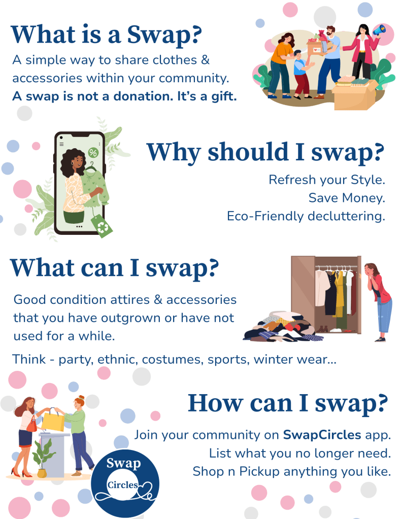 SwapCircles is a hyperlocal community-led solution to recirculate good-condition clothes and accessories — reducing waste, saving hard-earned money, and building a cleaner, equitable future, while making fashion joyful and affordable.